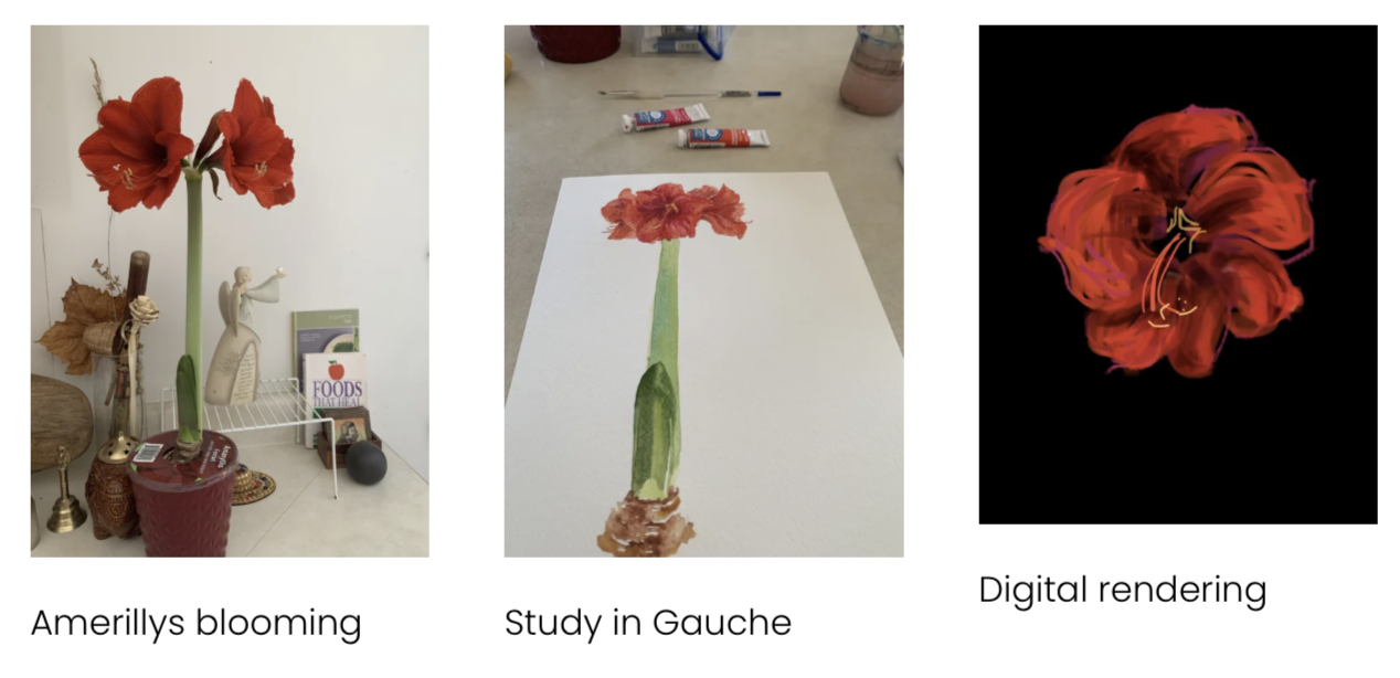 By then the Amerillys started blooming. The RED was striking, and for the next couple weeks, i saw myself capturing it, trying hands on watercolors, gauche, digital scribbles and photography. While rendering there felt a connection to the Flower, the plant but most of all the Color- shades of vermillion + crimson and tones of maroon at the center with delicate highlights of chrome yellow